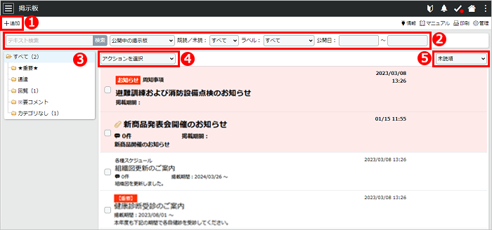 複数の掲示板をまとめて未読/既読にすることができます。複数の掲示板を選択して未読/既読にする場合は、チェックボックスにチェックを入れて操作対象を指定した後、[アクションを選択]から操作を選択します。