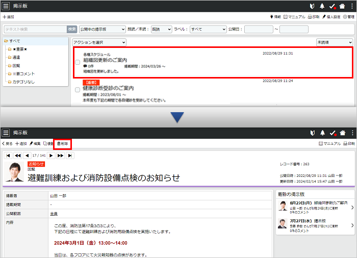 掲示板一覧から編集したいレコードを選択し、[]をクリックします。