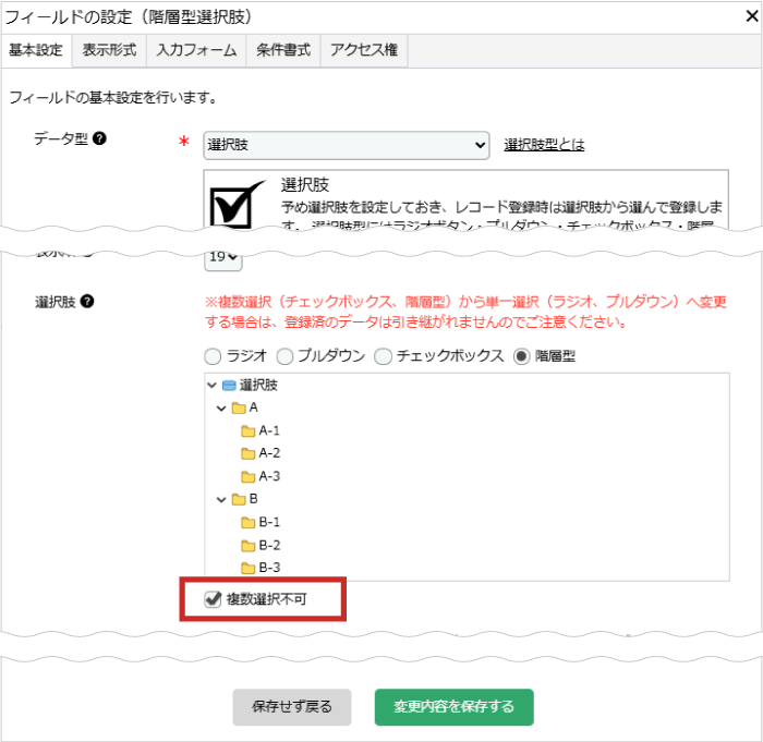 選択肢型フィールドの「階層型」は複数の選択肢を入力可能ですが、単一入力とする設定ができるようになりました。