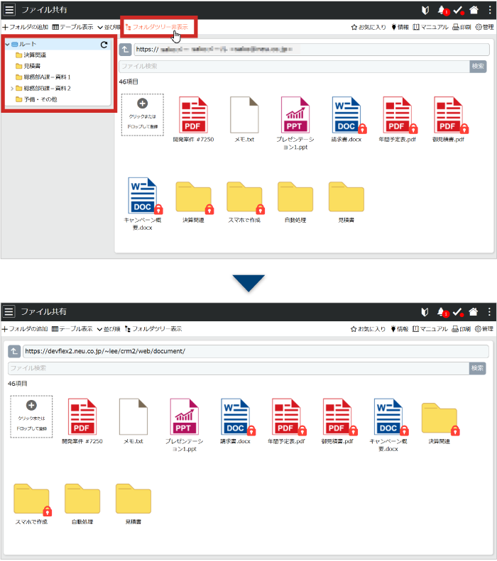 「フォルダツリー非表示」を押すことで、非表示に切り替えることができます。