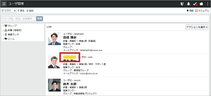 システム管理ユーザは、ユーザ管理画面にてパスワードを5回誤ってアカウントロックされたユーザを確認できます。リスト表示および詳細表示の際、ユーザIDの横に「ロックアウト」ラベルが表示されます。